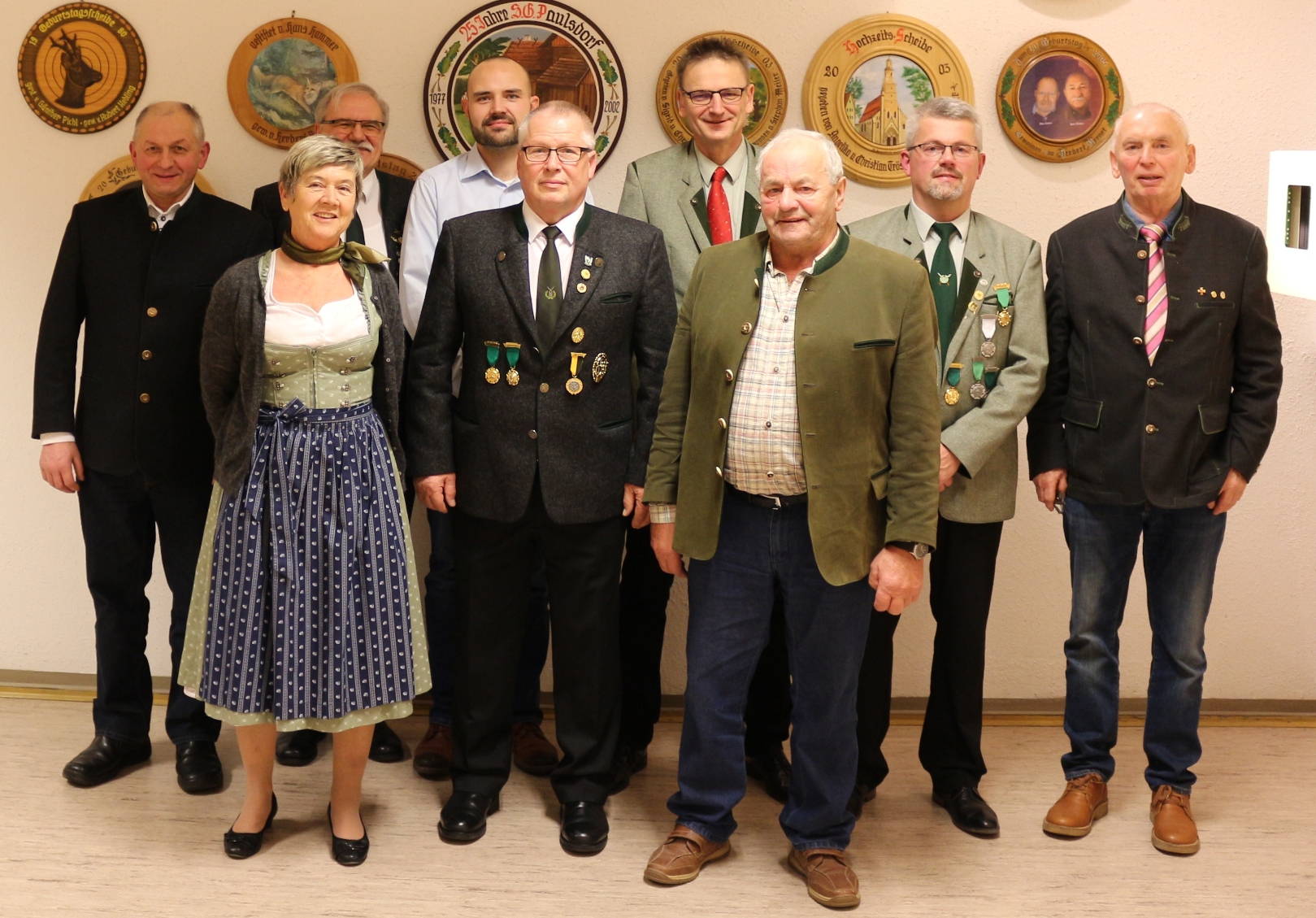 Schützenmeister Christian Schörner ehrte langjährige Mitglieder. Für 40 Jahre Mitgliedschaft bei der SG Paulsdorf erhielten Benno Jäger und Gerhard Singer sowie Heiner Dawidowski von der SG I und Tell Amberg als Zweitmitglied in Paulsdorf die Ehrennadeln des Oberpfälzer Schützenbundes in Gold, des Deutschen Schützenbundes sowie der Schützengesellschaft Paulsdorf mit Urkunden. Für 25 Jahre Treue zum Verein bekam Markus Bechtl die Ehrennadeln des Oberpfälzer Schützenbundes in Silber und des Deutschen Schützenbundes mit Urkunden.