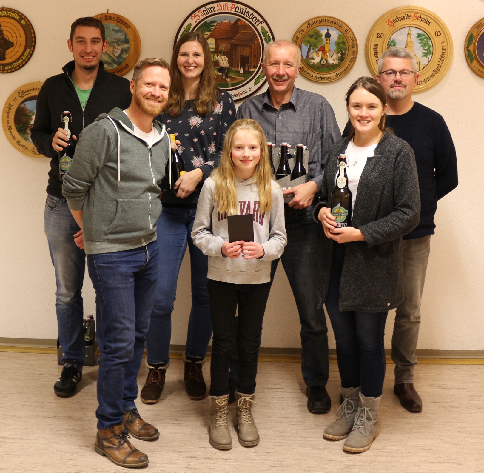 Bild von links Anna Meiler, Robert Meiler, Carolin Plata, Vitus Reichl, Ingrid Singer, Stephan Meiler, Schützenmeister Christian Schörner.