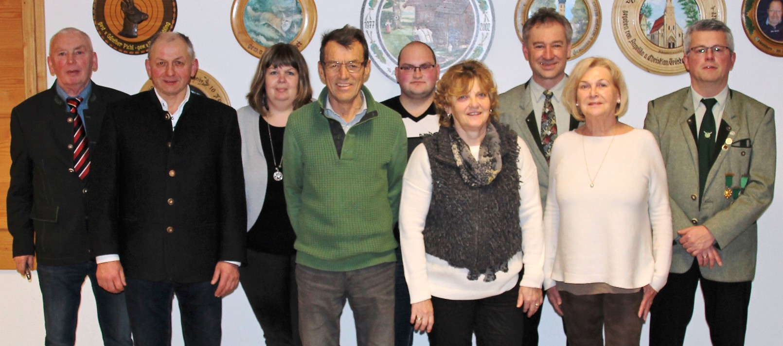 Bild von links: Gauschützenmeister Heinrich Fraunholz, 2. Bürgermeister Franz Weiß, Ulrike Meiler, Richard Butz, Lukas Bottek, Rita Butz, Jürgen Pichl, Christa Aschenbrenner, Schützenmeister Christian Schörner